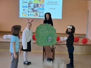 Ученики 1 «Б» и 1 «В» классов приняли участие в увлекательном библиотечном уроке, посвящённом творчеству В.Сутеева. Под руководством педагога-библиотекаря Постниковой Г.П. ребята познакомились с его замечательными произведениями. Учащиеся с удовольствием инсценировали сказки «Под грибом» и «Мешок яблок», а также проверили свои знания в весёлой викторине.